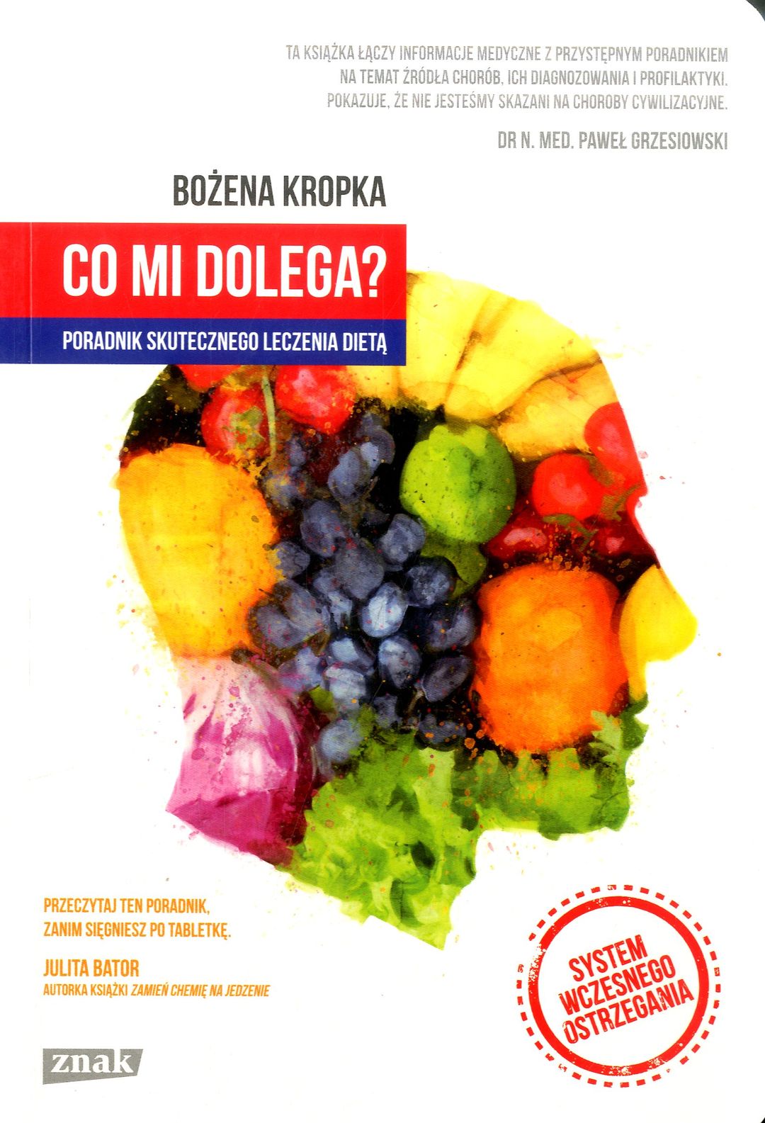 Zaczęło się od choroby córki. Na mocną wysypkę nie pomagały leki. Lekarze bezradnie rozkładali ręce i mówili, że to „taka uroda”. Bożena Kropka - ceniona specjalistka od spraw leczenia żywieniem wzięła sprawy w swoje ręce. Teraz do jej gabinetu przyjeżdżają setki chorych z całej Polski. Nikt nie jest skazany na choroby cywilizacyjne. Jeśli dokuczają Ci bóle głowy, zmęczenie, problemy skórne, drażliwość, problemy z trawieniem, ta książka jest dla ciebie! Dzięki niej nauczysz się interpretować pierwsze niepokojące symptomy i dowiesz się, o jakie badania poprosić w gabinecie lekarskim. Autorka patrzy na pacjenta całościowo. Wyjaśnia, że 80% chorób wynika ze złej diety. Wskazuje, dlaczego jelita mają wpływ na nasz nastrój oraz jakie są źródła alergii i nietolerancji pokarmowych. Czy to możliwe, że zwykły jogurt owocowy może mieć związek z przewlekłym zapaleniem zatok? Co mi dolega? Poradnik skutecznego leczenia dietą przedstawia praktyczny system wczesnego ostrzegania i skuteczny program zdrowego życia. Bożena Kropka wskazuje, jak dieta w decydujący sposób wpływa na nasze zdrowie. Jakie pokarmy łagodzą lub leczą, np. anemię, choroby wątroby, czy tarczycy. Jej praktyczny jadłospis to coś więcej niż łatwe wskazówki - to przepis na zdrowie. Joanna Gruszka - dietetyk kliniczny