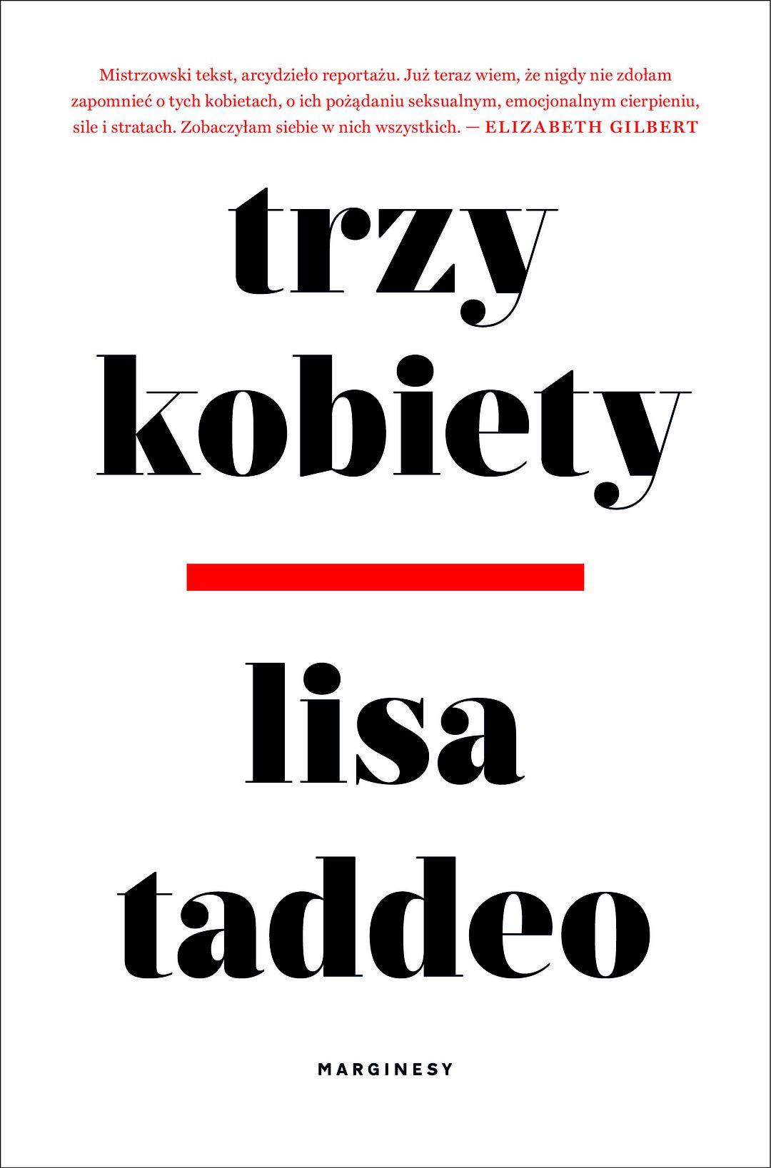 U góry okładki: Mistrzowski tekst, arcydzieło reportażu. Już teraz wiem, że nigdy nie zdołam zapomnieć o tych kobietch, o ich pożądaniu seksualnym, emocjonalnym cierpieniu, sile i strachu. Zobaczyłam siebie w nich wszystkich. - Elizabeth Gilbert.