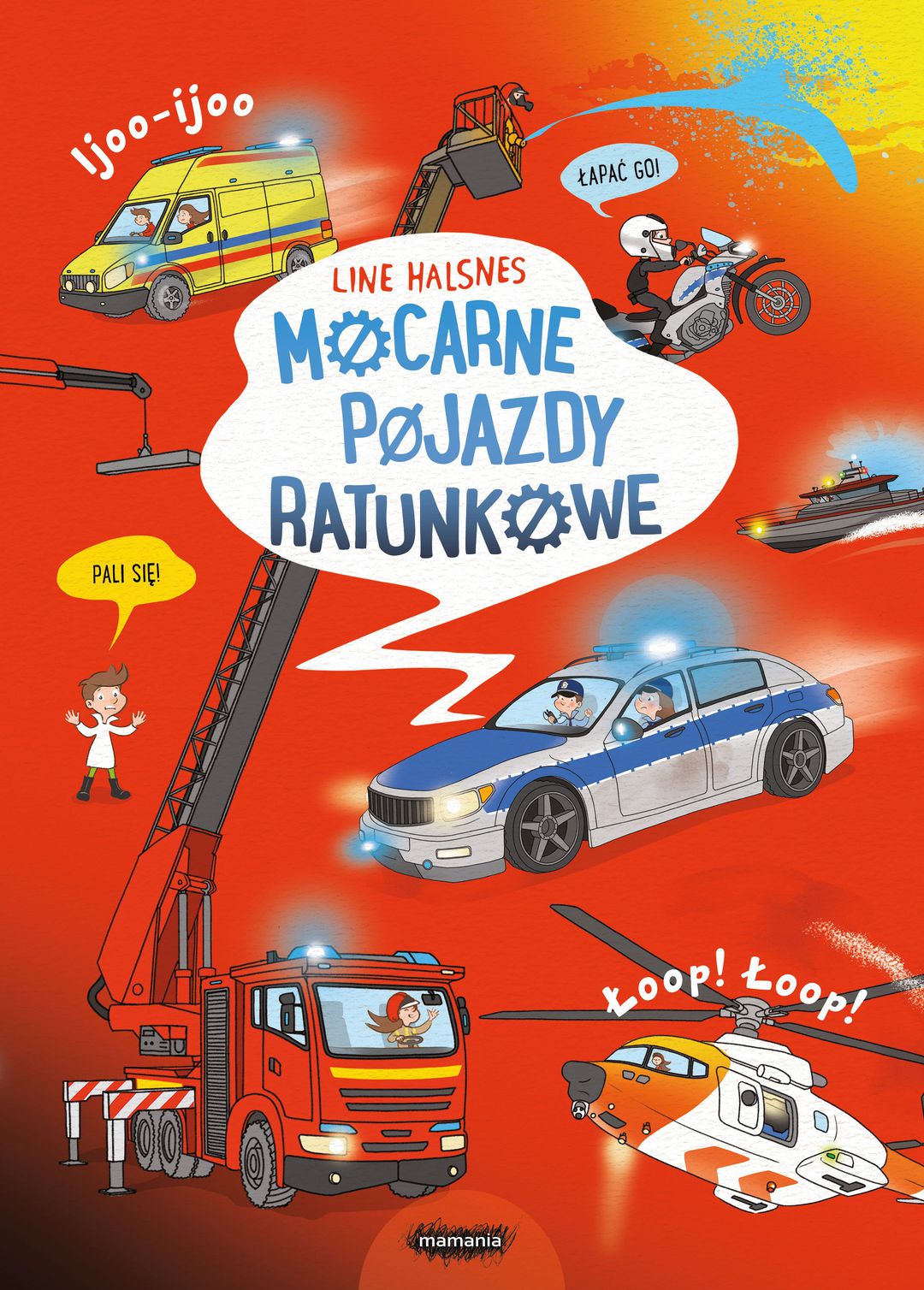Wóz strażacki, ambulans, radiowóz, motocykl policyjny, helikoptery i łodzie – to pojazdy, które każdego dnia ratują czyjeś zdrowie i życie. Czego używają strażacy? Jak przewieźć ciężko chore osoby? Kiedy przydaje się łódź ratunkowa? Ida i Hans opowiadają o tym, jak i czym szybko dotrzeć na miejsce wypadku i do czego służą poszczególne elementy wyposażenia. Bardzo szczegółowe ilustracje zaspokoją ciekawość wszystkich miłośników migających świateł i głośnego dźwięku syren. W serii ukazały się „Mocarne dinozaury“ oraz „Mocarne maszyny“.[lubimczytac.pl]